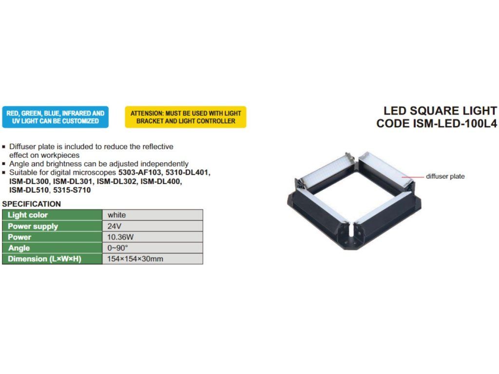 Lumină LED pătrată pentru microscoape digitale de la INSIZE. Este inclusă o placă de difuzie pentru a reduce reflexia pe piesele de lucru.