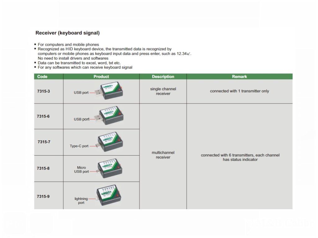 - Receptoarele multicanale cu diferiți conectori pot fi conectați cu până la șase dispozitive de măsurare INSIZE, fiind disponibil și receptorul multicanal pentru conectarea a șaisprezece dispozitive 7315-2. Dispozitivele pot fi schimbate în funcție de preferințe, deoarece fiecare se conectează cu un cod ID unic.