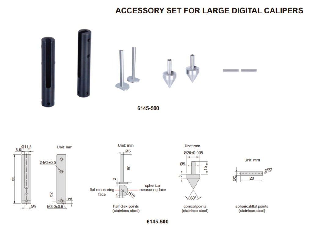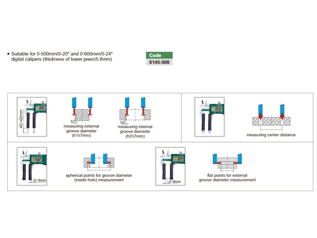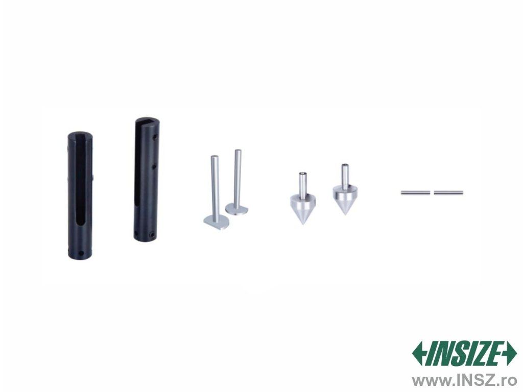 Set accesorii pentru șublere digitale mari de la INSIZE. Potrivit pentru șublere digitale 0-500 mm și 0-600 mm (grosime ciocuri inferioare ≤ 5,6 mm). Conține extensii și vârfuri.