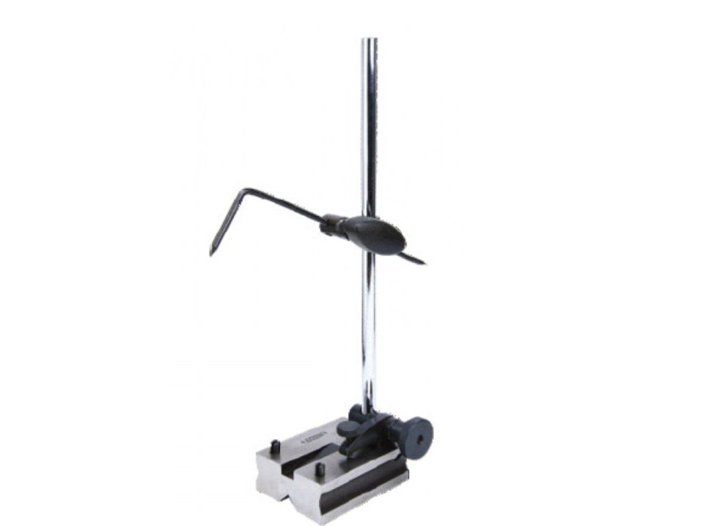 Acul de trasat de înălțime de la Insize cu reglare fină, cu bază canelată și 2 știfturi de fixare care se proptesc la marginea plăcii pentru trasat.