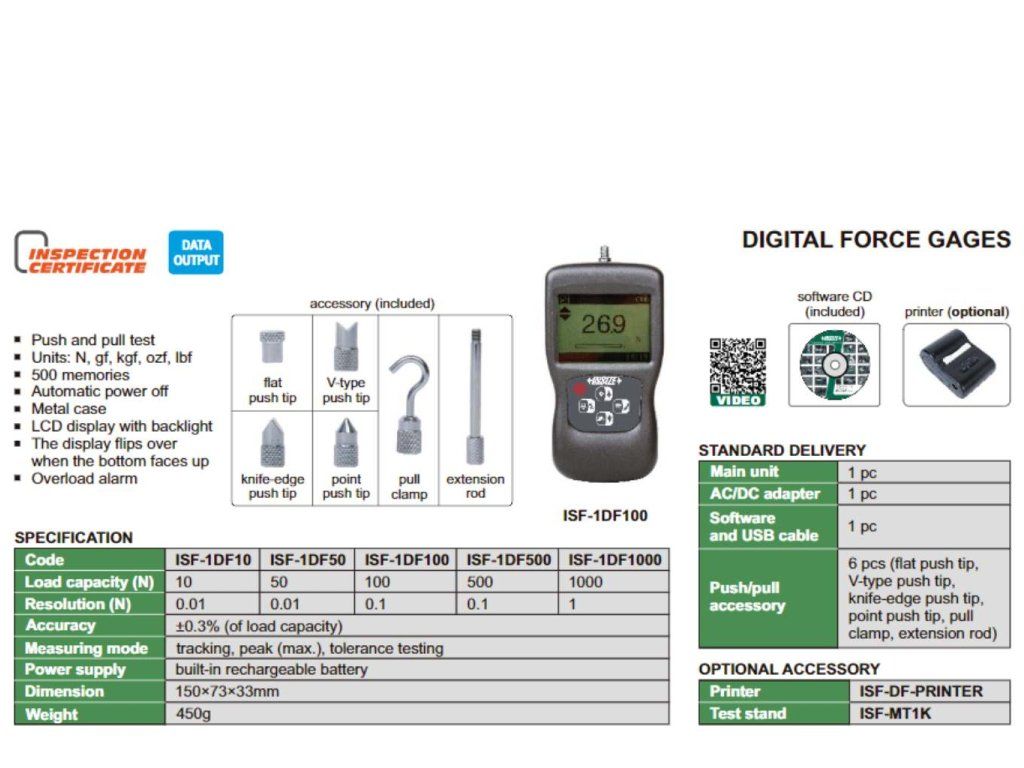 Dinamometru digital de la INSIZE cu sarcină maximă 100 N. Rezoluție 0,01 N, precizie ±0,3 %, măsurare împingere și tragere, memorie pentru 500 valori măsurate. Inclusiv software pentru ieșire date prin USB.