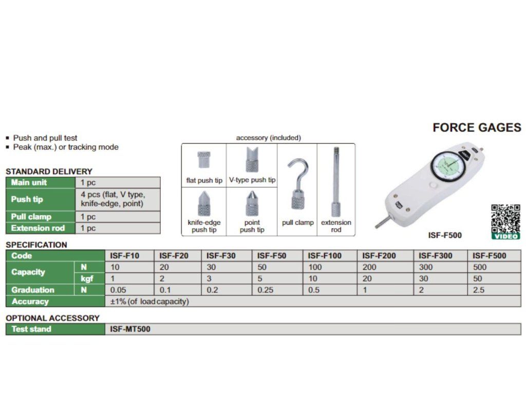 Dinamometru mecanic de la INSIZE cu sarcină maximă 300 N. Rezoluție 2 N, precizie ±1 %, măsurare împingere și presiune, măsurare valoare maximă și monitorizare a desfășurării măsurătorilor.