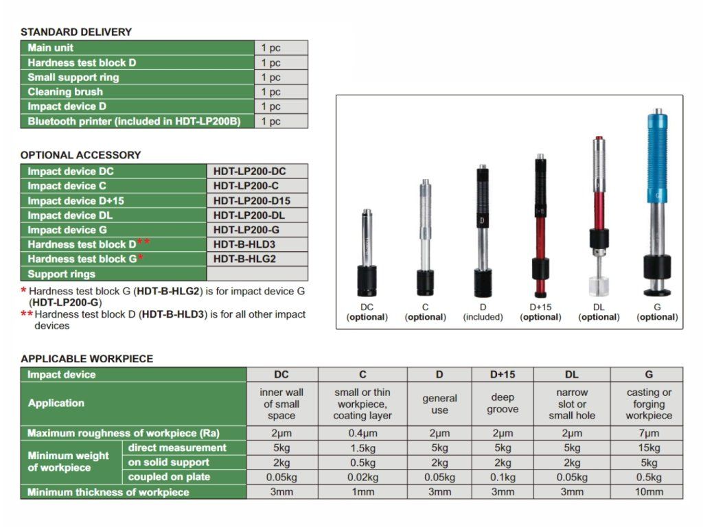Durimetru portabil Leeb (HLD) de la INSIZE cu sondă externă de tip D și posibilitate de conversie a scalei la Vickers (HV), Brinell (HB), Rockwell (HRC, HRB), Shore (HSD) și SGM. Calculează automat valori minime, maxime și medii, poate salva până la 300 valori măsurate.