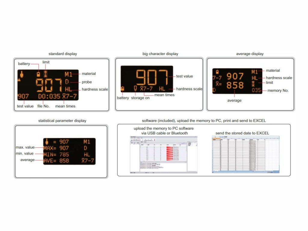 - În baza Leeb (HLD), conversie la Vickers (HV), Brinell (HB), Rockwell (HRA, HRB, HRC), Shore (HS) și rezistență la tracțiune