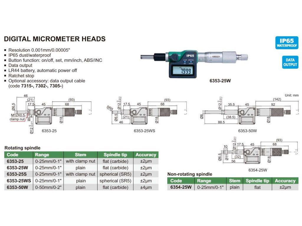 Cap de micrometru digital INSIZE, tijă netedă, arbore cu vârf sferic. Interval 0-25 mm, gradație 0,001 mm.