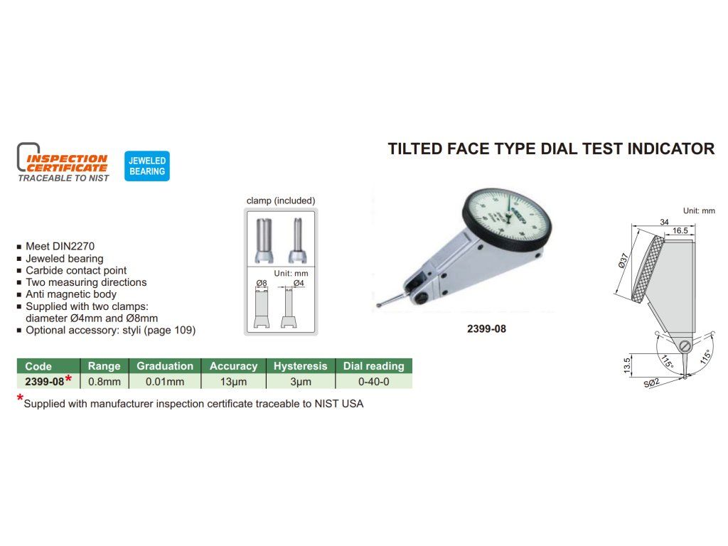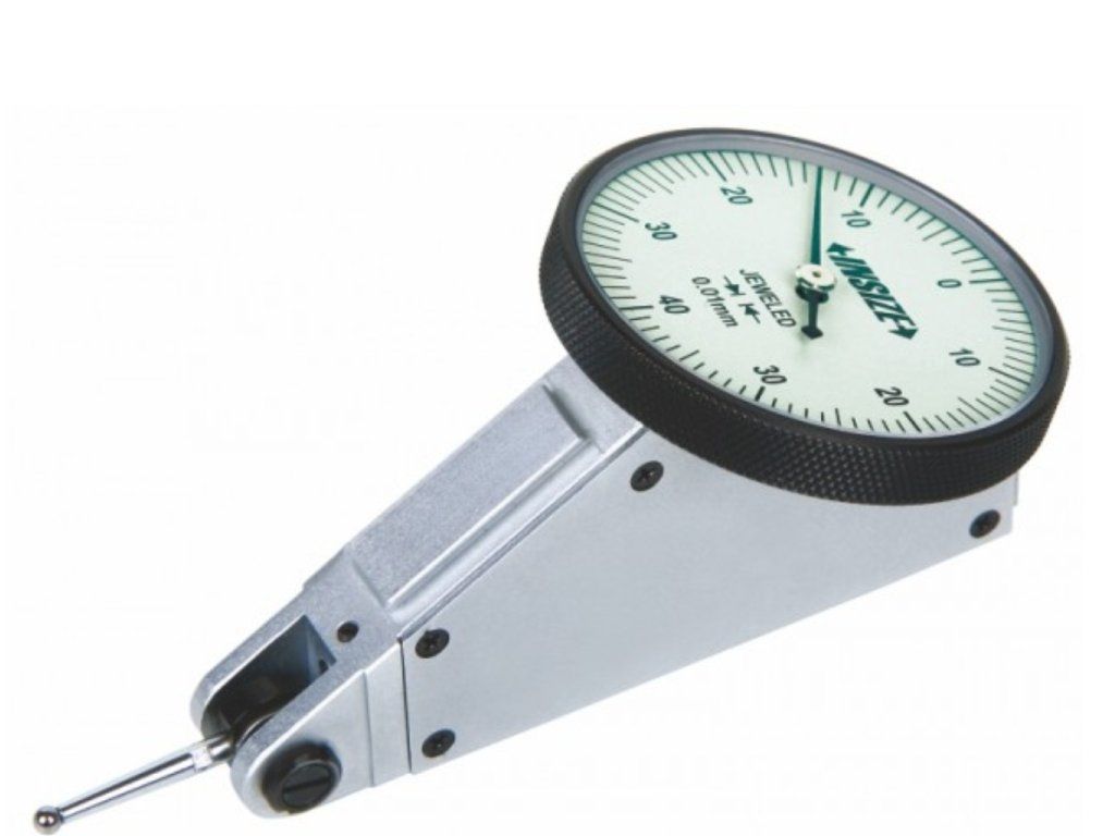 Ceas comparator antimagnetic cu levier, cu cadran înclinat de la INSIZE interval 0,8 mm, rezoluție 0,01 mm, palpator din carbură, pini de prindere.