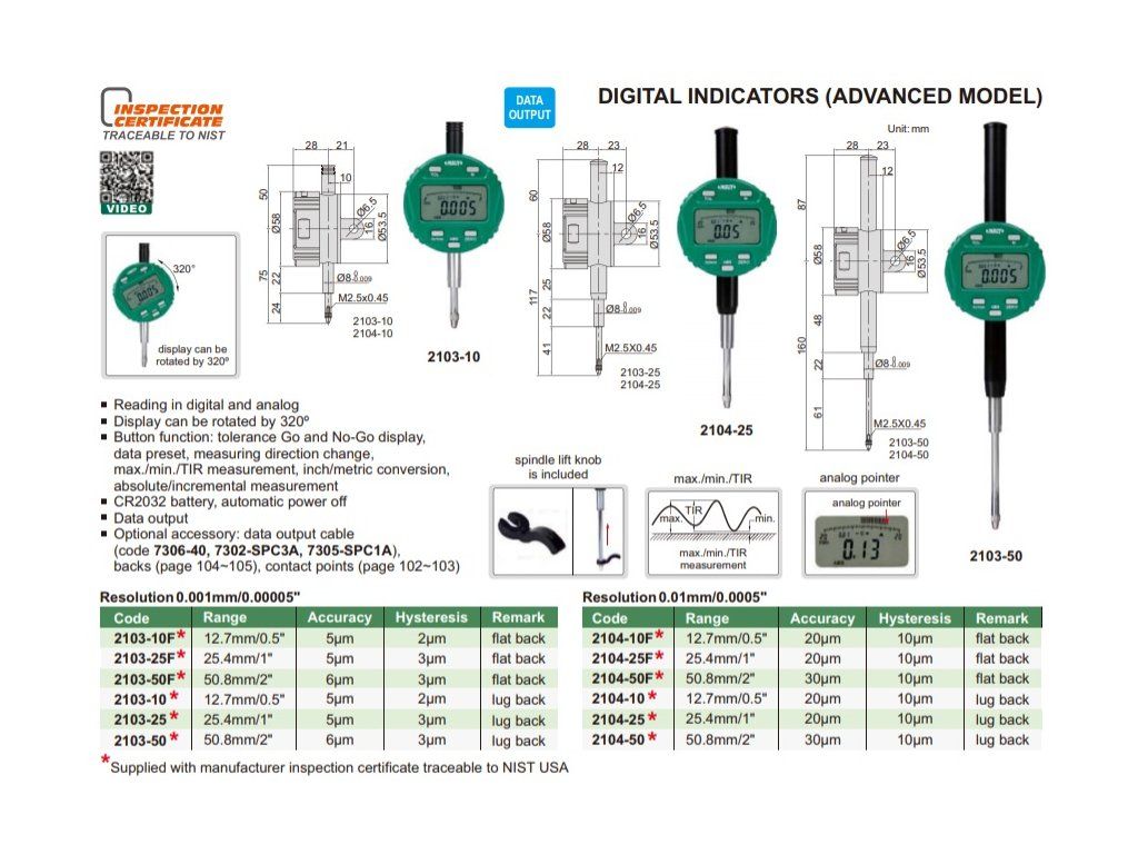 Ceas comparator INSIZE cu interval de măsurare 50,8 mm, rezoluție 0,01 mm/0,0005″, ieșire de date, capac spate cu clemă de prindere, display rotativ.