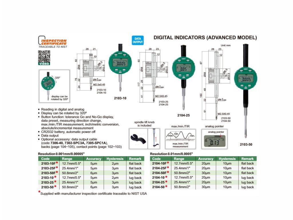 Ceas comparator INSIZE cu interval de măsurare 25,4 mm, rezoluție 0,01 mm. Display-ul afișează atât valori analogice, cât și cele digitale și poate fi rotit la 320°. Posibilitate de setare toleranță, schimbarea direcției de măsurare, presetare și alte funcții.