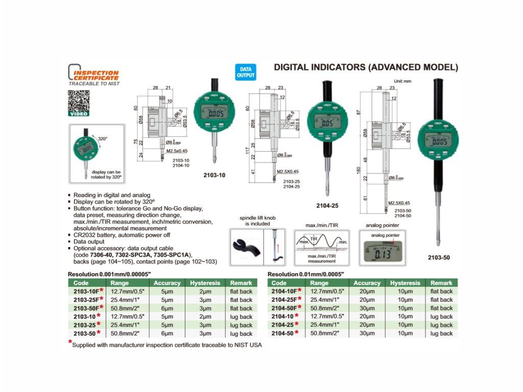 Ceas comparator INSIZE cu interval de măsurare 50,8 mm/2", rezoluție 0,001 mm/0,00005″. Display-ul afișează atât valori analogice, cât și cele digitale și poate fi rotit la 320°. Posibilitate de setare toleranță, schimbarea direcției de măsurare, presetare și alte funcții.
