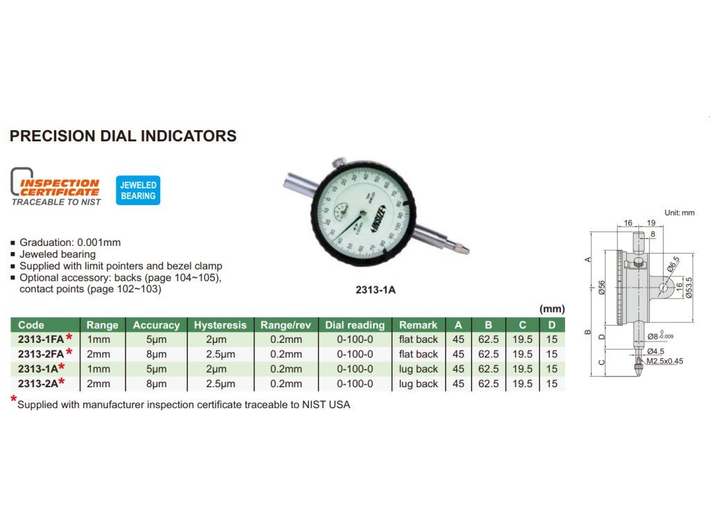 Ceas comparator de precizie 2/0,001 mm, carcasă spate cu clemă de prindere INSIZE