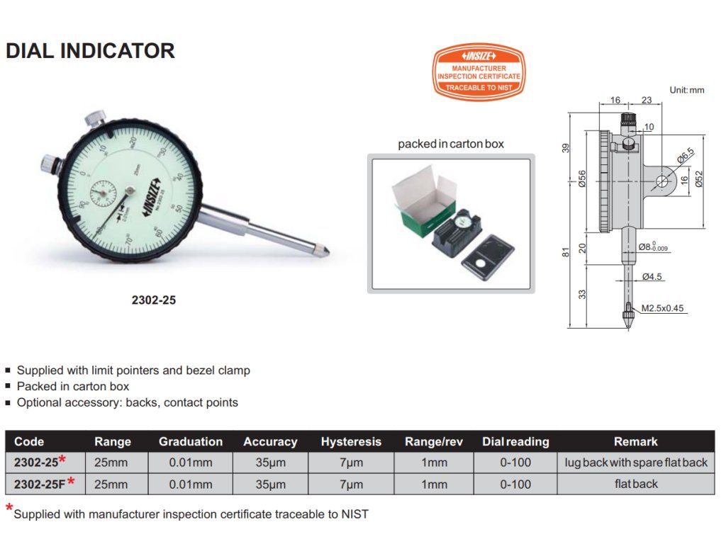 Ceas comparator mecanic de la INSIZE, interval de măsurare 25 mm, rezoluție 0,01 și precizie 35 µm, carcasă spate cu clemă de prindere (livrat cu carcasă plată de schimb).
