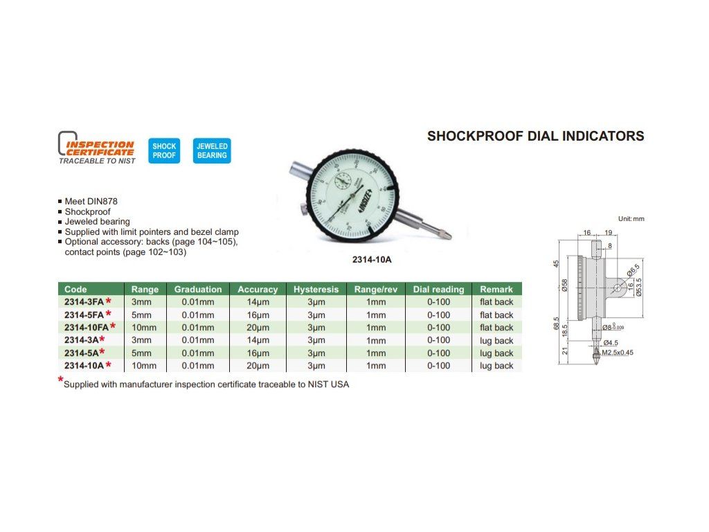 Ceas comparator 5/0,01 mm, rezistent la șocuri 2314-5FA INSIZE