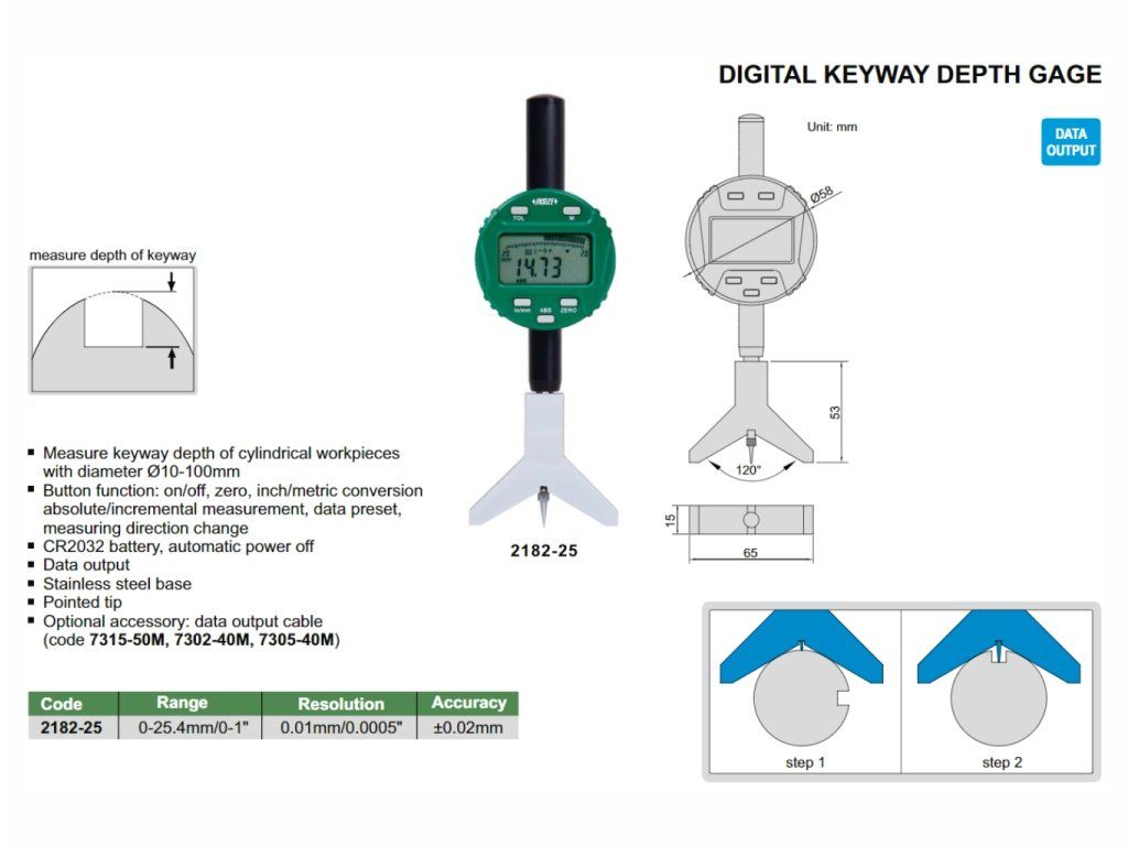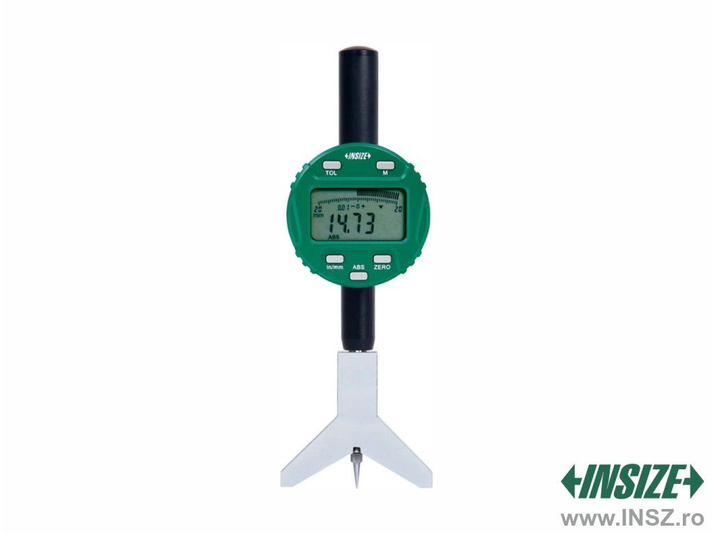 Ceas comparator digital de adâncime de la Insize, interval 0-25,4 mm, rezoluție 0,01 mm, pentru măsurarea adâncimii obiectelor cilindrice.