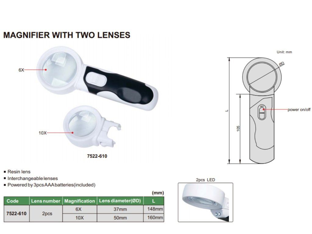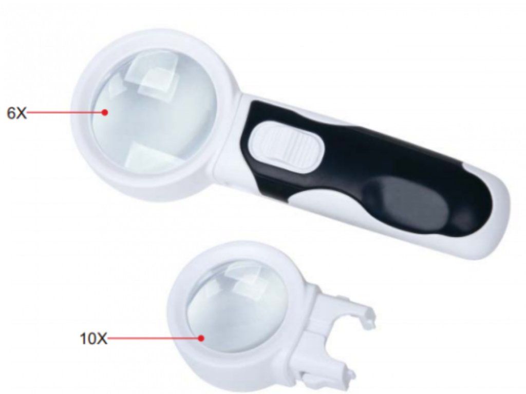 Lupă de la Insize cu iluminare LED, cu 2 lentile și mărire 6x și 10x.
