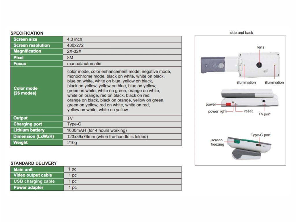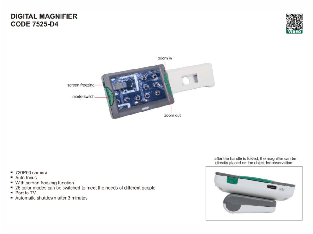 Lupă digitală de la INSIZE cu mărire 2-32×. Cameră de 720P cu focalizare automată, display LCD cu dimensiuni 4,3". Comutare până la 26 de moduri de culoare.