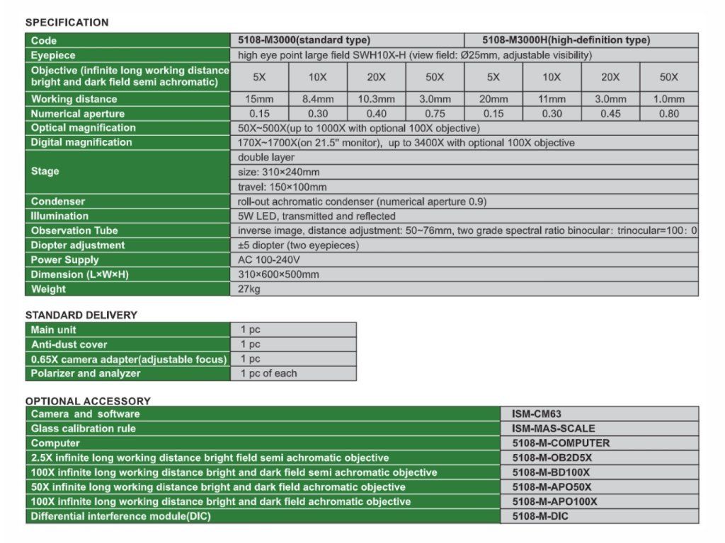 Microscop metalografic 5108-M3000H (model cu rezoluție ridicată) de la INSIZE cu obiective cu câmp întunecat pentru a observarea probelor care nu pot fi distinse de fundal, cât și cu câmp luminos pentru observarea probelor, care au contrast sau culoare (de exemplu, probe histologice colorate). Sistem optic cu corecție infinită a aberației cromatice, tub de observație cu trei căi, filtru de polarizare.