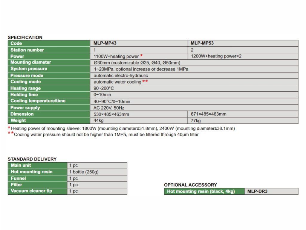 Presa metalografică de montaj MLP-MP53 (model avansat) de la INSIZE funcționează în intervalul de temperatură între 90 până în 200 °C. Este prevăzută cu răcire automată cu apă, ceea ce reduce timpul total de pregătire a probelor la 6 minute. Cu posibilitate de introducere a două probe în același timp. De asemenea, oferă setare de presiune între 1-20 MPa și un sistem de control, care permite stocarea până la 10 procese presetate, pentru a elimina erorile de configurare.
