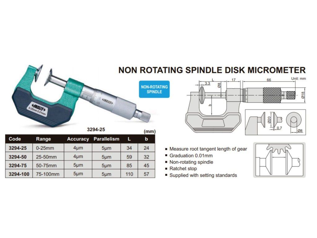 Micrometru mecanic cu discuri și arbore nerotativ de la Insize, cu interval 0-25 mm și rezoluție 0,01 mm, pentru măsurarea roților dințate.