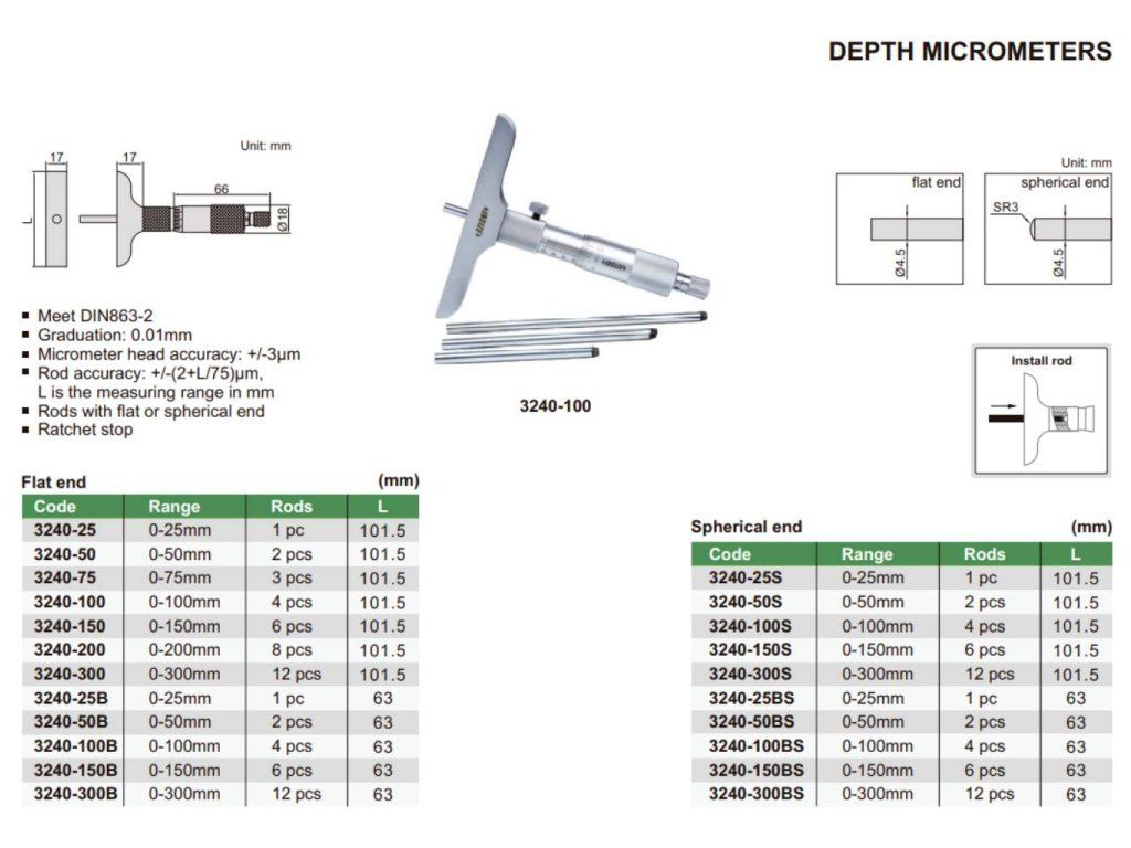 Micrometru mecanic de adâncime sferic 0-100/0,01 mm, talpă 101,5 mm INSIZE