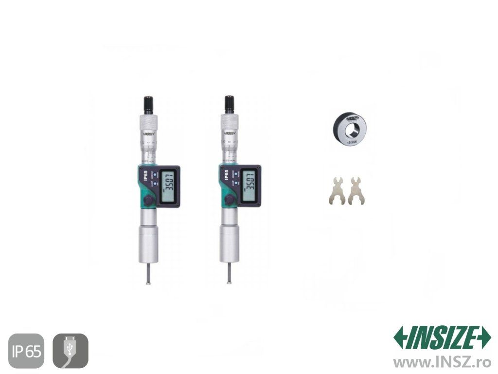 Set cu două micrometre digitale în 2 puncte tip A de la Insize, cu intervale 2-3 mm și rezoluție 0,001 mm. Cu inel de setare ø 2,5 mm, grad de protecție IP65.