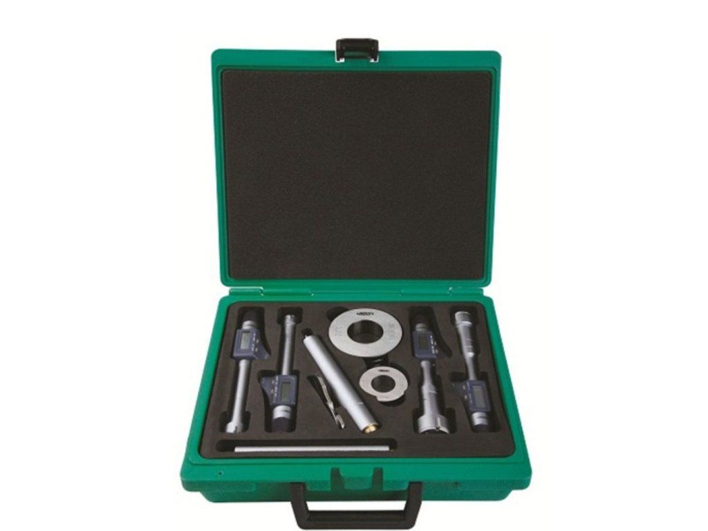 Set cu patru micrometre digitale în 3 puncte tip D de la Insize, cu intervale 50-100 mm și rezoluție 0,001 mm. Cu inele de setare ø 62 și 87 mm și tijă de extensie cu o lungime de 150 mm, grad de protecție IP65.