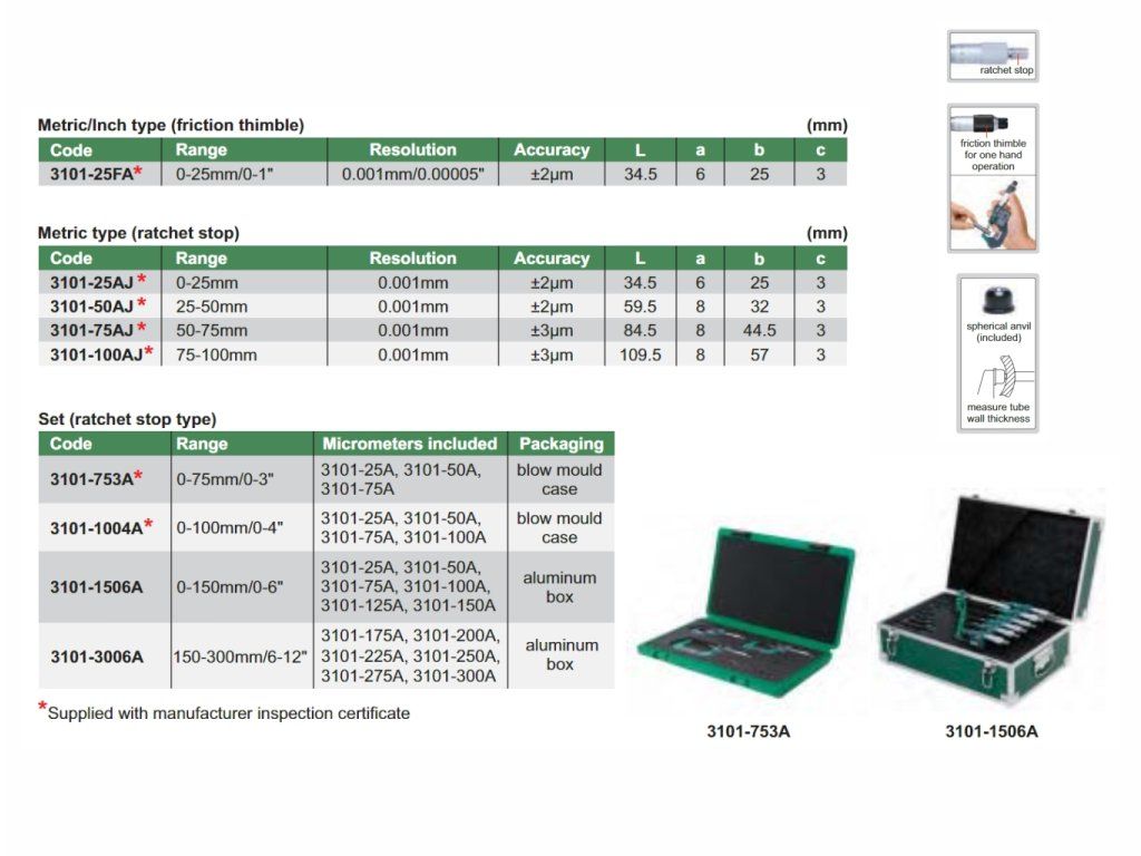 Micrometru digital IP65, 0-25/0,001 mm, cu port ieșire date și tambur cu clichet INSIZE