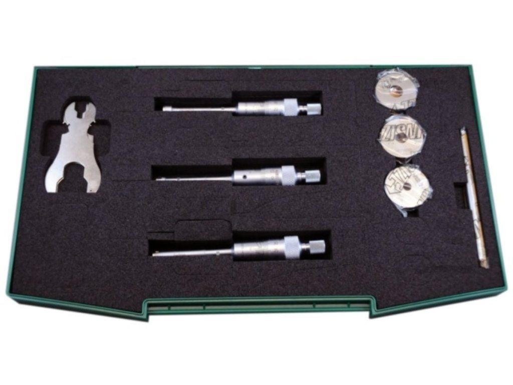 Set cu trei micrometre mecanice în 3 puncte tip B de la Insize, cu intervale 6-12 mm și rezoluție 0,001 mm. Cu inele de setare ø 6, 8 și 10 mm și tijă de extensie cu o lungime de 100 mm.