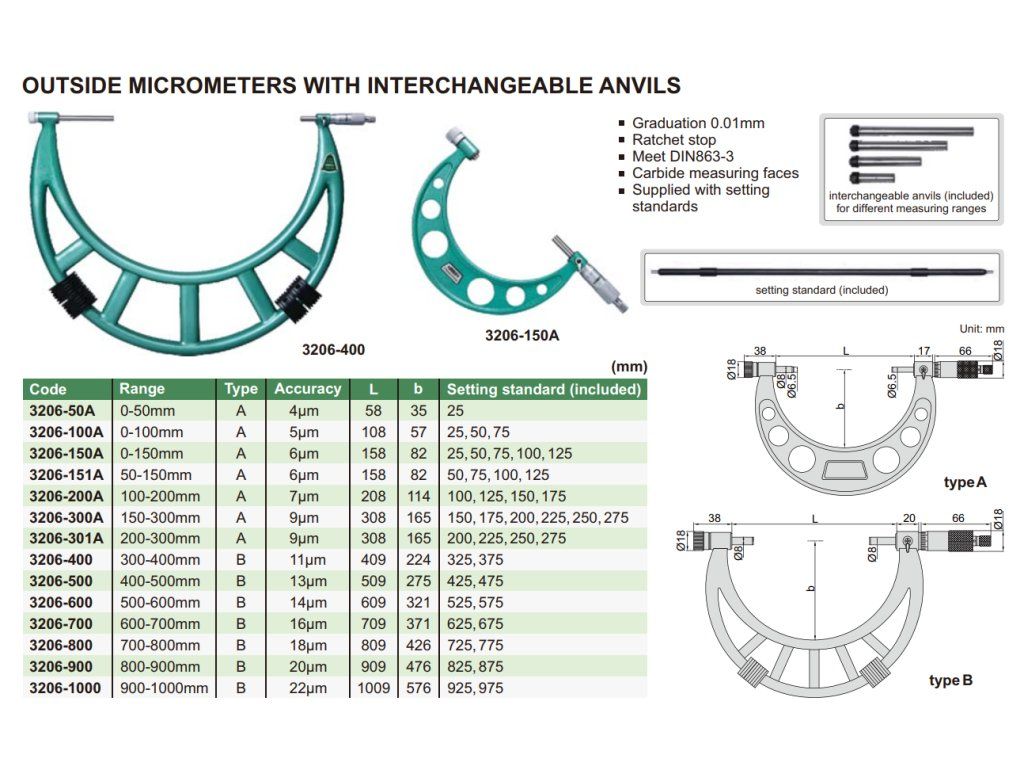 Micrometru mecanic de exterior 100-200/0,01 mm cu nicovale interschimbabile, tip A INSIZE