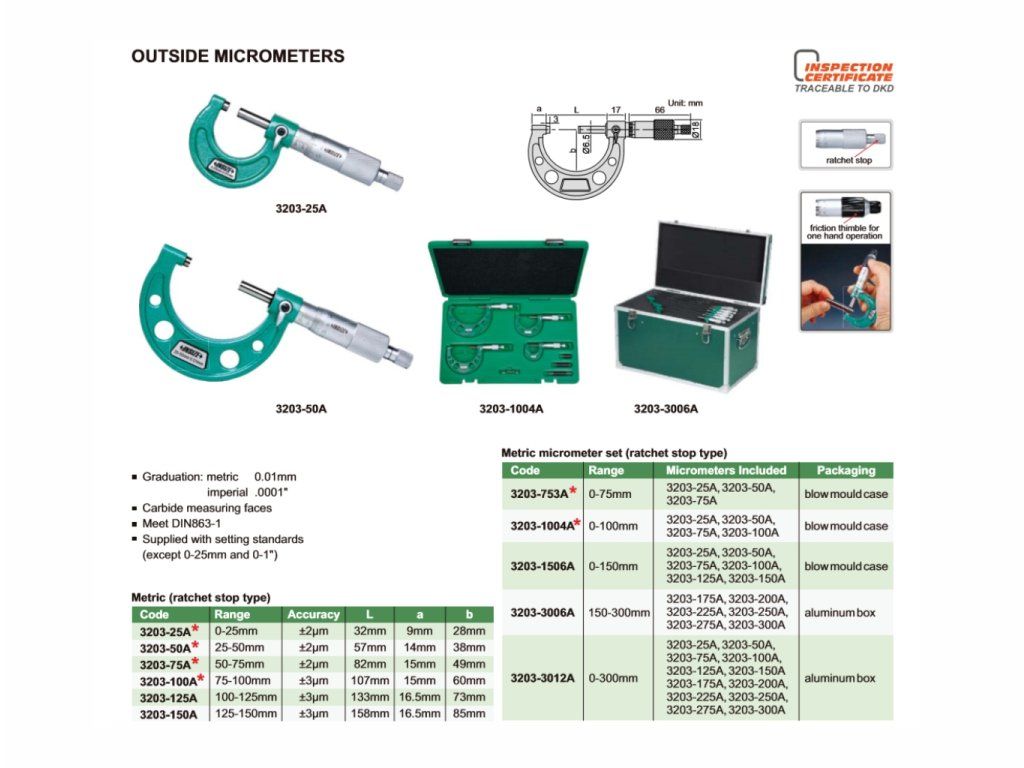 Set de șase micrometre mecanice de exterior de la Insize, cu interval 0-150 mm și rezoluție 0,01 mm. Inclusiv cală de reglare.