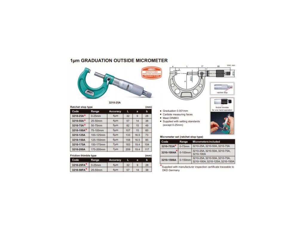 Set de trei micrometre mecanice de exterior seria 3210 de la INSIZE, cu interval 0-75 mm și rezoluție 0,001 mm. Cu suprafețe de măsurare din carbid și șurub de blocare.