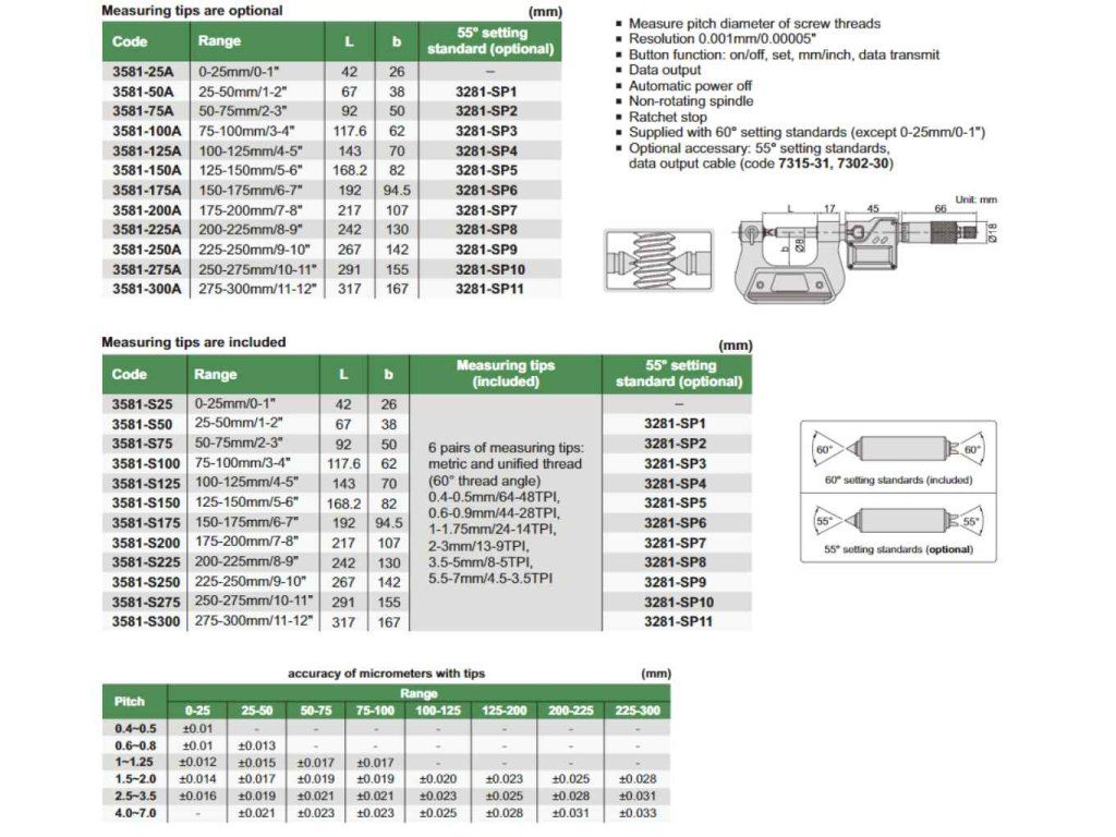 Micrometru digital pentru filete exterioare 175-200/0.001 mm, vârfuri de măsurare incluse INSIZE