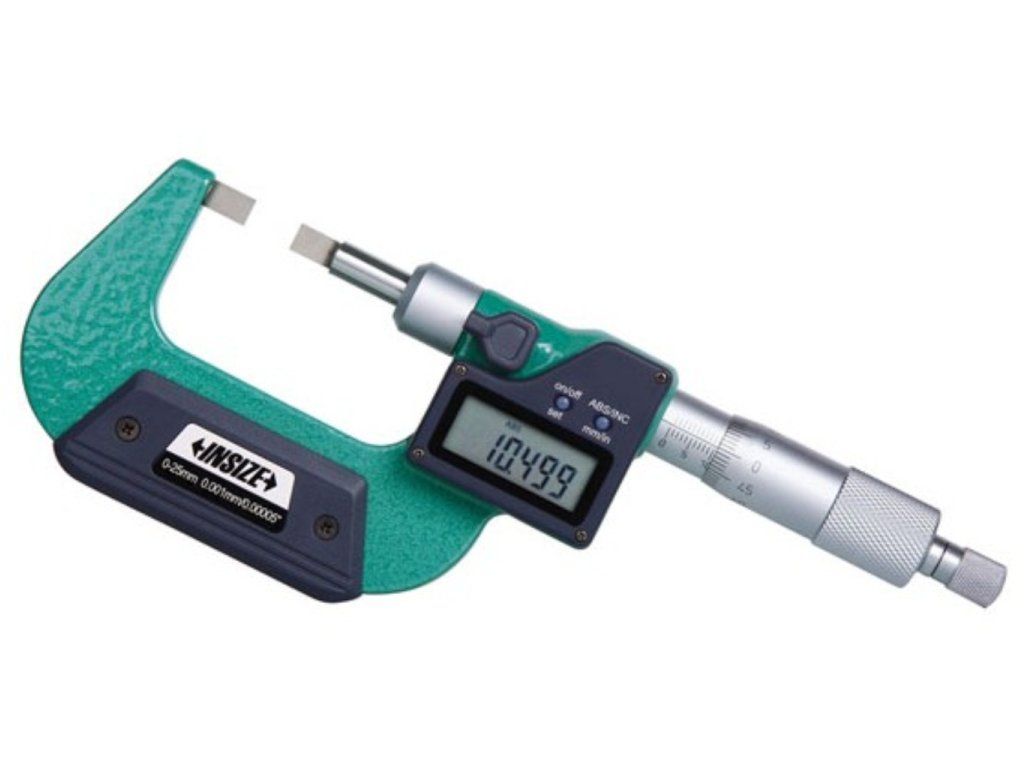 Micrometru digital de la INSIZE cu suprafețe de măsurare subțiri. Interval 0-25 mm și rezoluție 0,001 mm, pentru caneluri, arbori canelați. Cu arbore nerotativ, tip A.