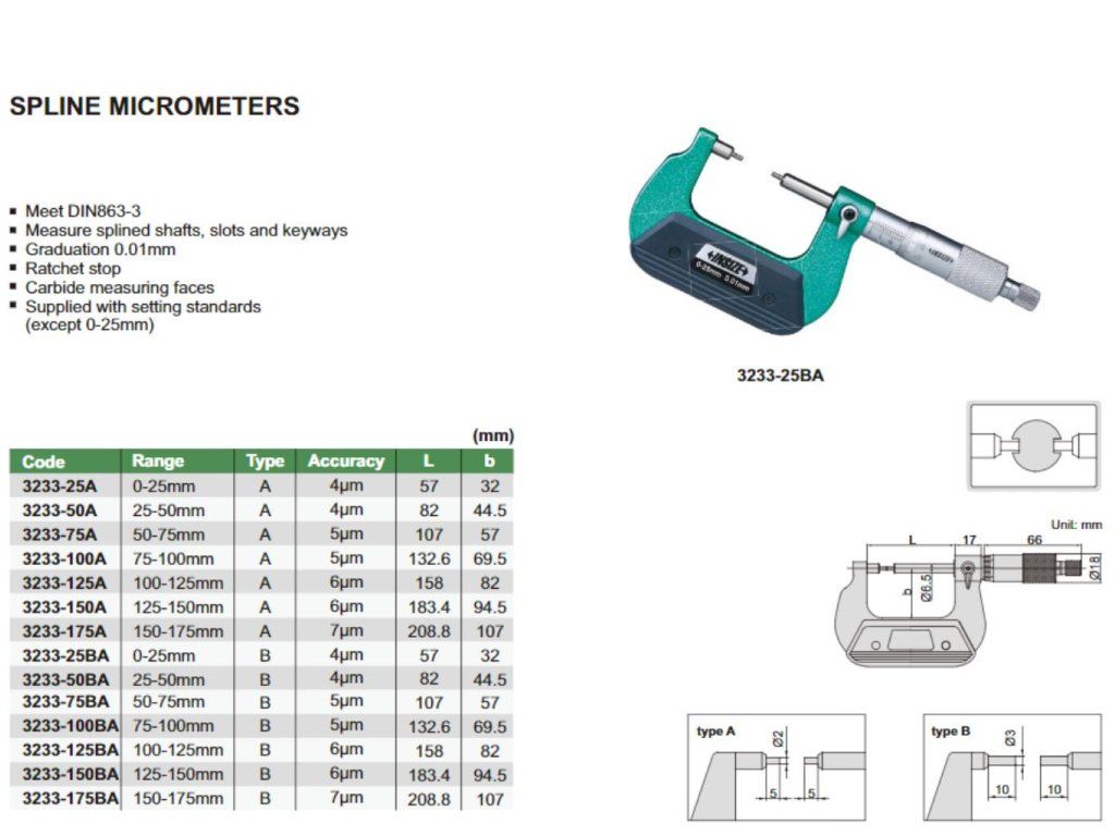 Micrometru mecanic de la Insize cu suprafețe de măsurare subțiri din carbid. Interval 0-25 mm și rezoluție 0,01 mm, pentru caneluri, arbori canelați. Tip B - suprafețe de măsurare din carbid.