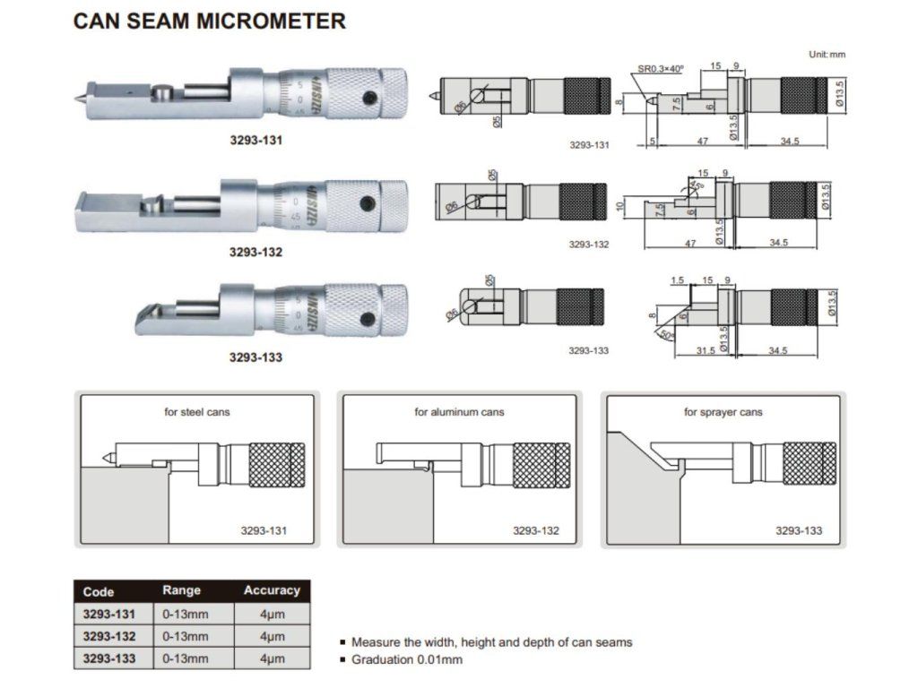Micrometru mecanic special de la INSIZE cu interval 0-13 mm și rezoluție 0,01 mm, pentru măsurarea cusăturilor conservelor.