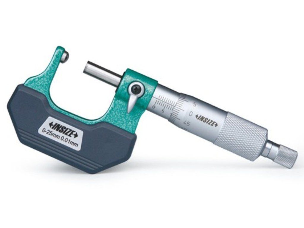 Micrometru mecanic de la Insize, cu suprafețe de măsurare din carbid, interval 25-50 mm și rezoluție 0,01 mm, pentru măsurarea grosimii pereților țevilor, suprafețelor curbate, rulmenților, inelelor. Tip B - nicovală sferică pe ambele părți.