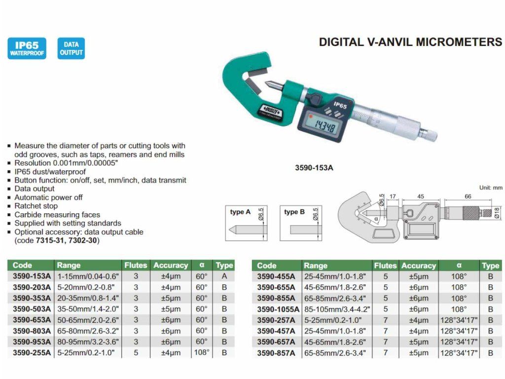 Micrometru digital prismatic rezistent la apă de la Insize, cu interval 85-105 mm și rezoluție 0,001 mm, pentru măsurarea sculelor de tăiere cu cinci muchii, cum ar fi burghie, alezoare, freze etc. Cu port ieșire date.