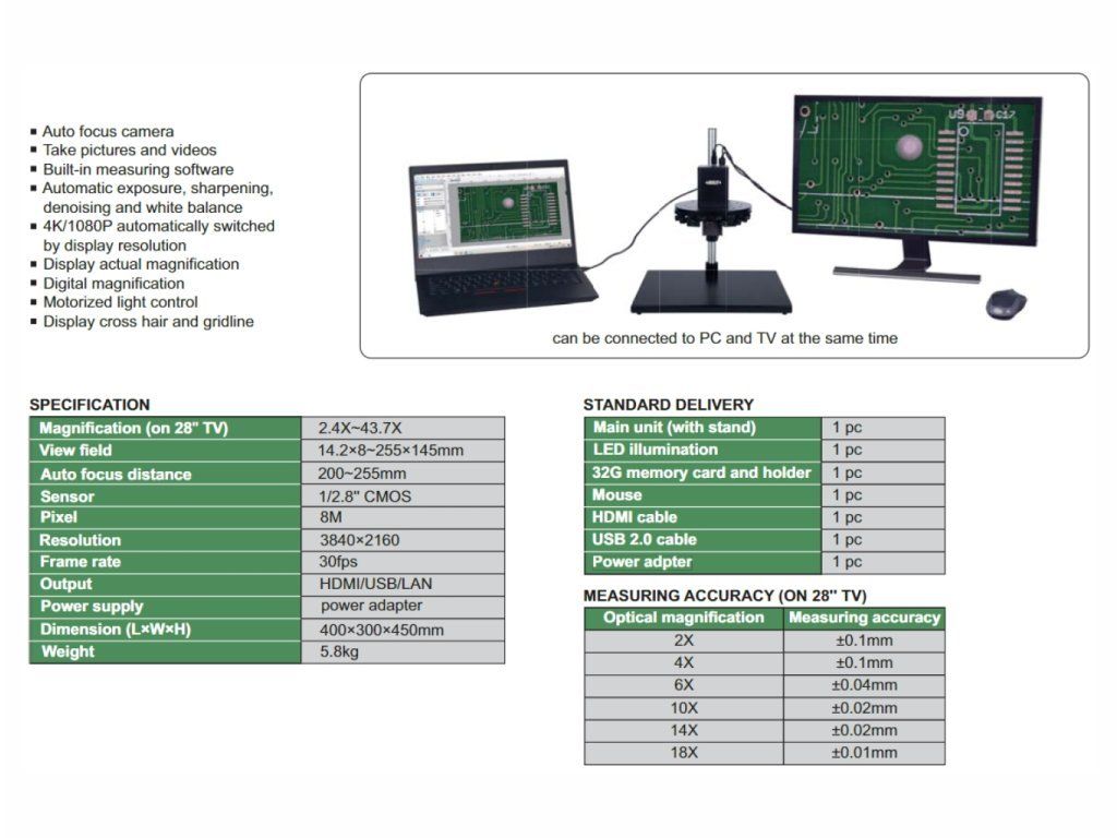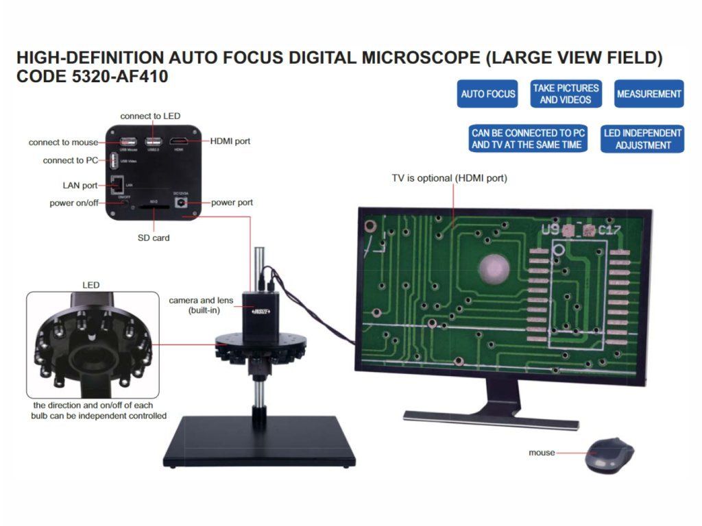 Microscop digital de măsurare 5320-AF410 de la INSIZE cu cameră cu autofocus, rezoluție 4K (8 MPx), mărire 2,4 ~ 43,7x (pe ecran 28"), control motorizat al iluminatului și software de măsurare încorporat.