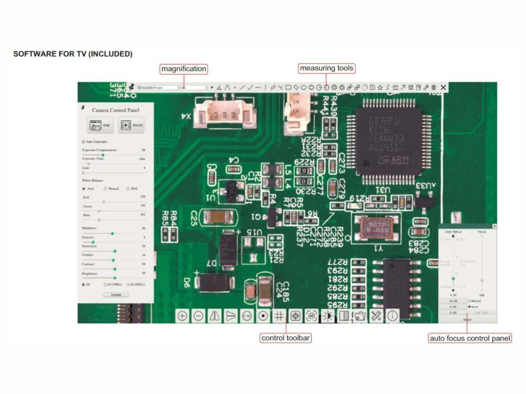 - Software încorporat pentru măsurare, pentru realizare de video și foto, editarea imaginilor și alte funcții