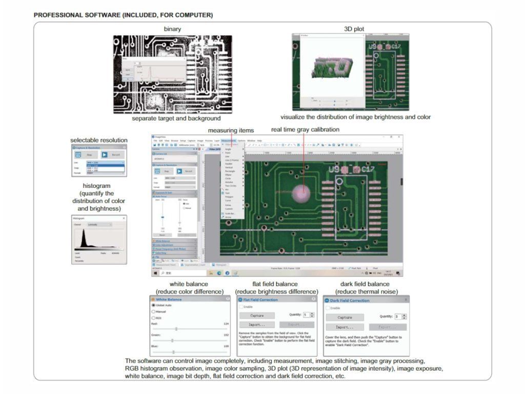 Software-ul poate controla complet imaginea, inclusiv măsurarea, compunerea imaginii, procesarea imaginii în scală de gri, observarea histogramei RGB, eșantionarea culorii imaginii, redarea 3D (afișarea intensității imaginii 3D), expunerea imaginii, balansul de alb, adâncimea de biți a imaginii, corecția câmpului plat și corecția câmpului întunecat etc.