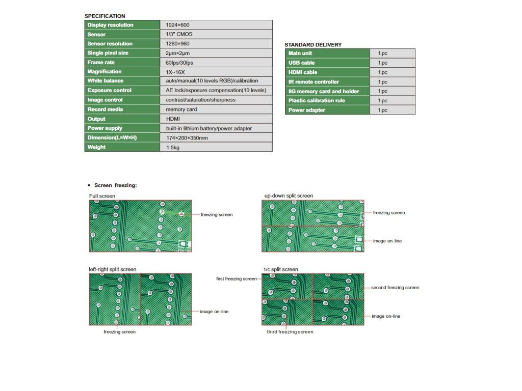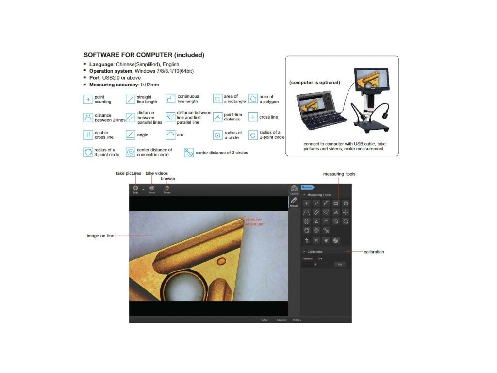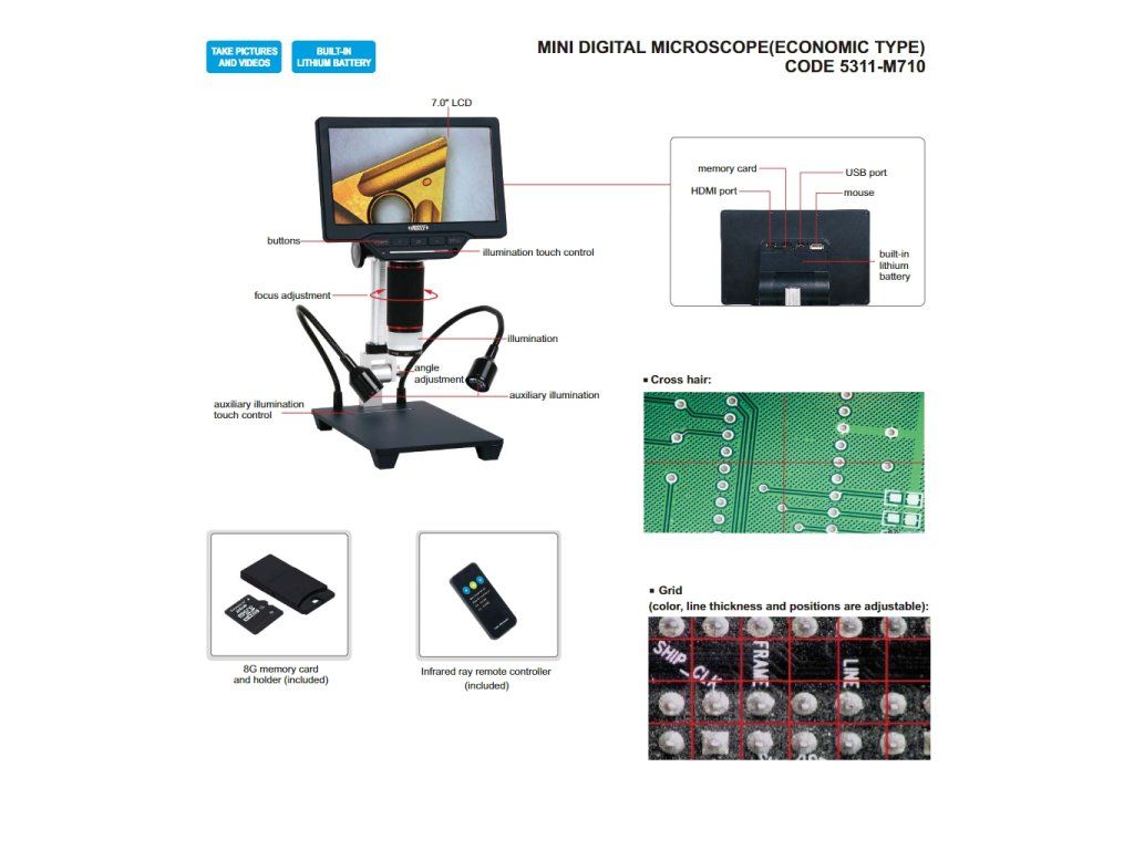 Mini microscop digital de la INSIZE, cu mărire 1~16X, display 7" LCD, rezoluție 1024×600px și senzor 1/3" CMOS. Software pentru conectare la PC și măsurare propriu-zisă.