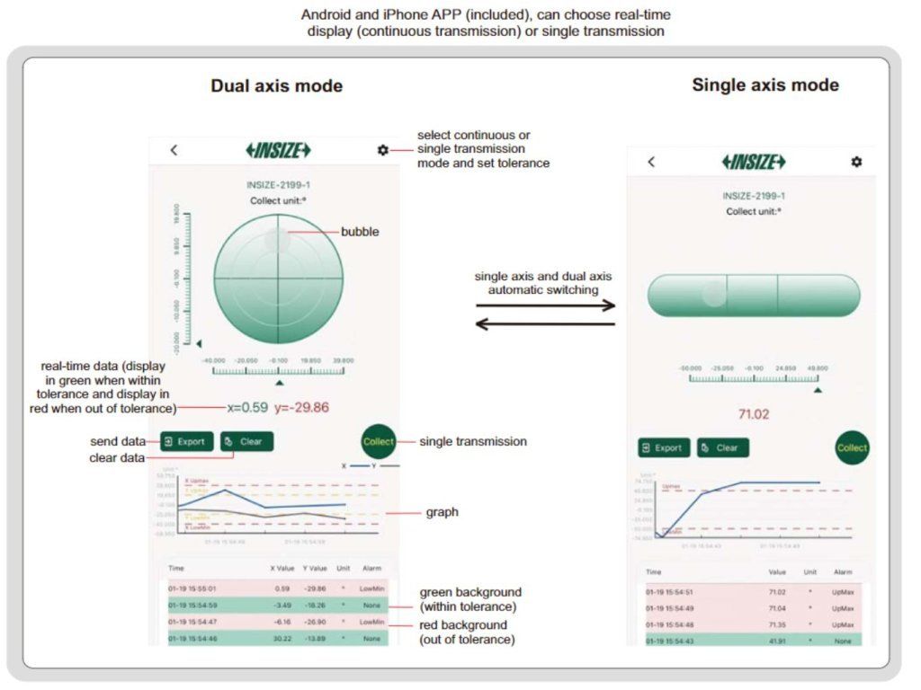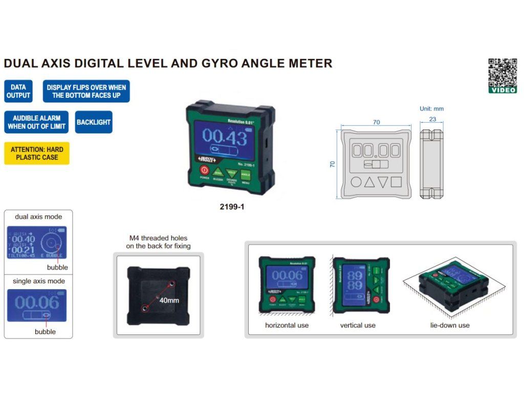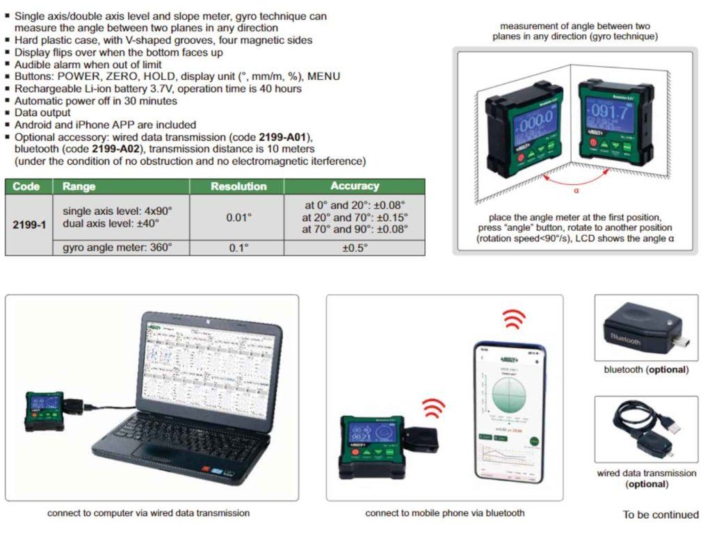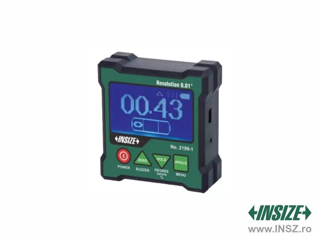 Nivelă digitală cu măsurare pe două axe și raportor (inclinometru) giroscopic de la INSIZE. Nivela cu măsurare pe o singură axă are intervalul 4x90°, iar cea cu măsurare pe două axe ± 40°, raportorul giroscopic este cu intervalul 360°.