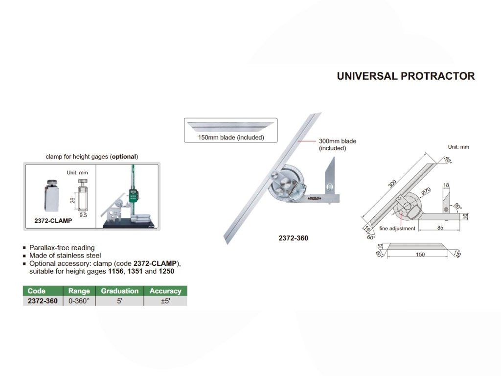 Raportor universal cu lupă și nonius de la INSIZE, citire nedistorsionată, interval 0~360°, potrivit pentru utilizare cu șubler de înălțime.