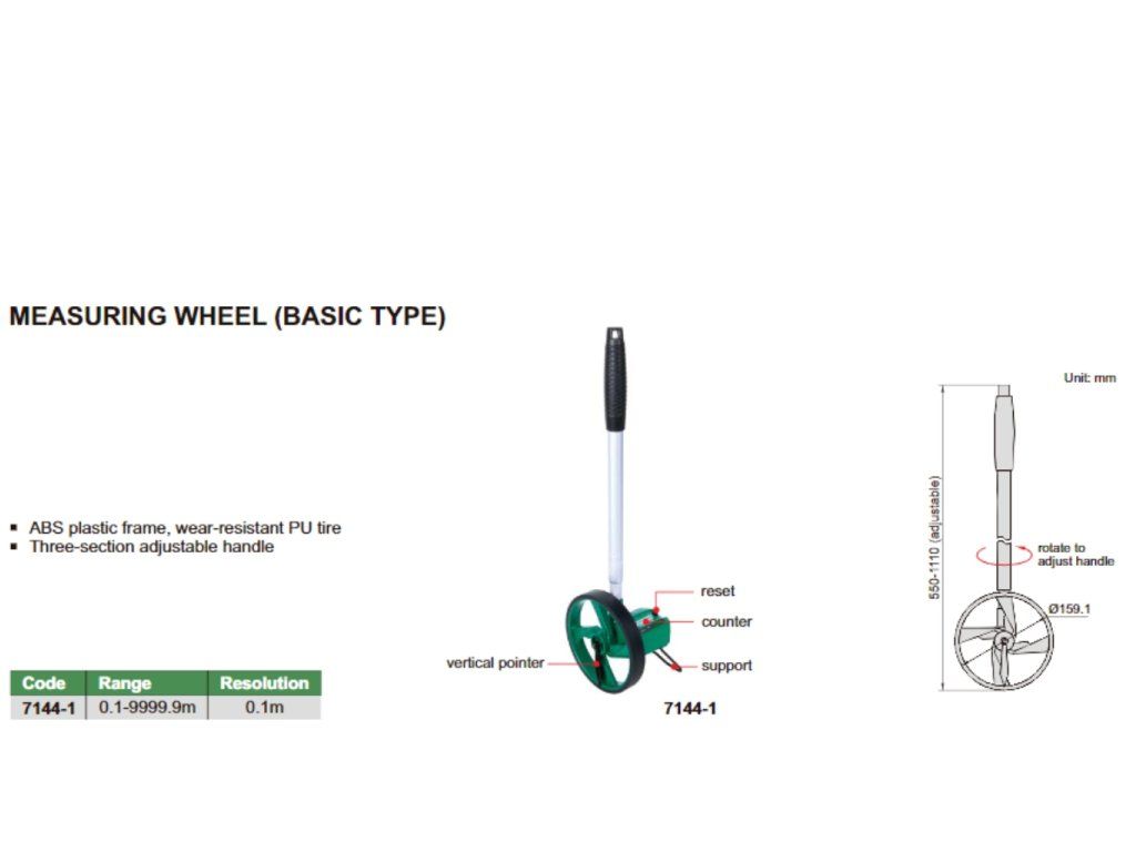 Roată de măsurare de înaltă calitate cu diametru 159,1 mm de la INSIZE, interval de măsurare 9999.9 m și mâner ajustabil. Cauciuc PU, material ABS rezistent.