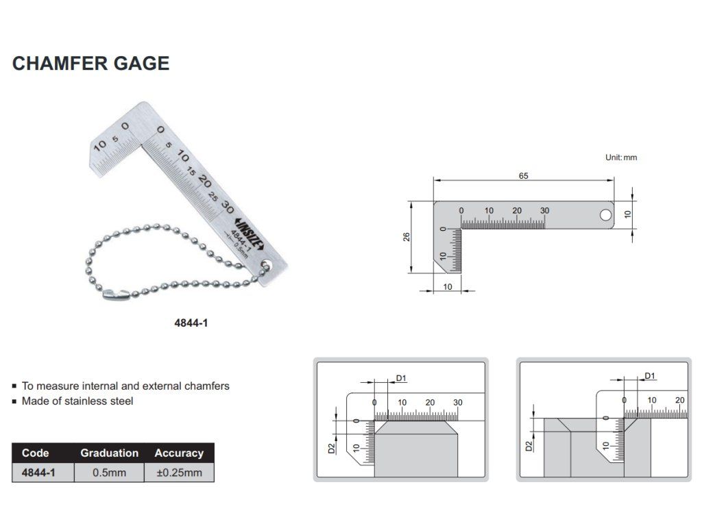Mini echer INSIZE măsurători interioare și exterioare de șanfren, cu precizie de 0,25 mm.
