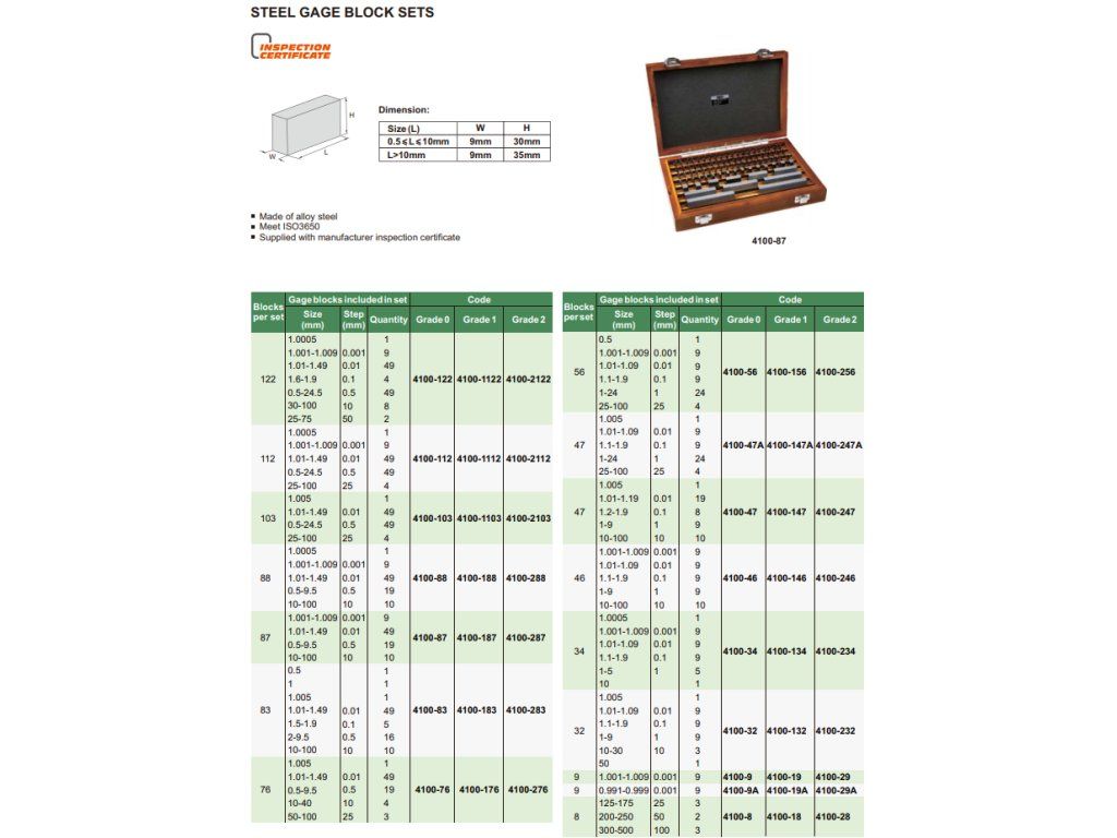 Set de cale plan paralele din oțel aliat de la Insize, 46 piese cu interval 1,001 - 100 mm, clasă de toleranță 1. În conformitate cu ISO 3650.