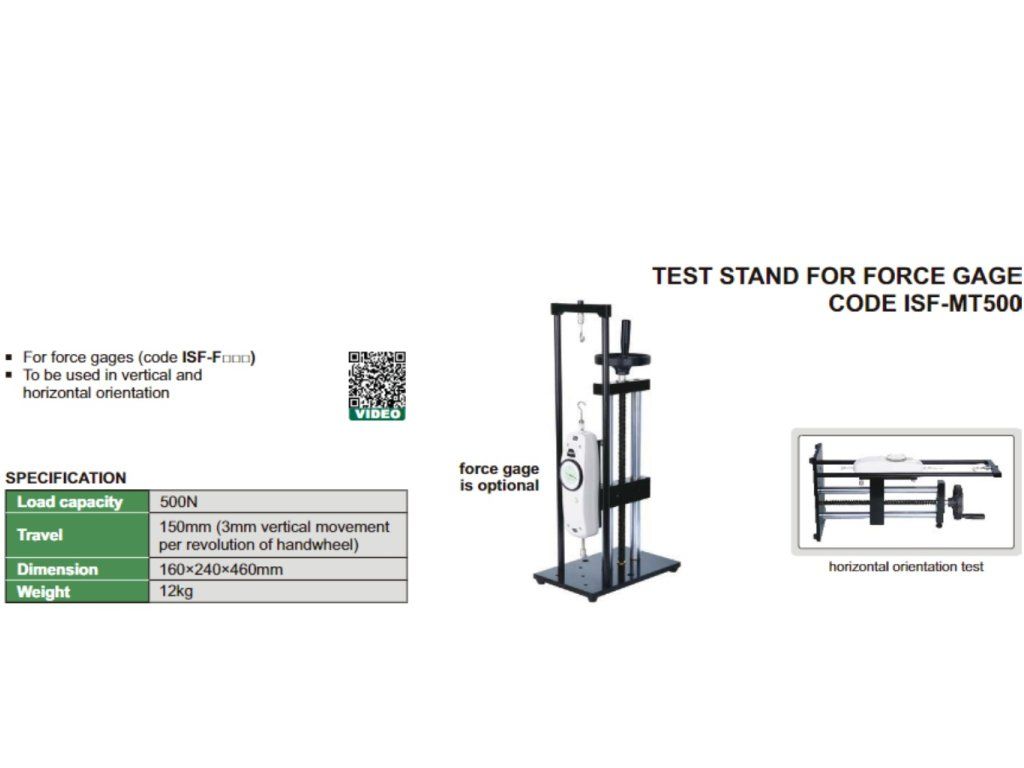 Stand de testare de la INSIZE pentru dinamometre din seria ISF-F, cu utilizare în poziție orizontală și în cea verticală, cursă 150 mm, forță maximă de măsurare 500 N.