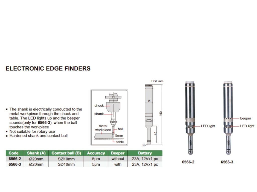 Detector de muchii electronic cu o lungime de 160 mm de la INSIZE. Vârful este ghidat electric către piesa de prelucrat metalică cu ajutorul mandrinei și a mesei. De îndată ce vârful atinge piesa de prelucrat, se aprinde semnalul LED și se aude un semnal acustic.