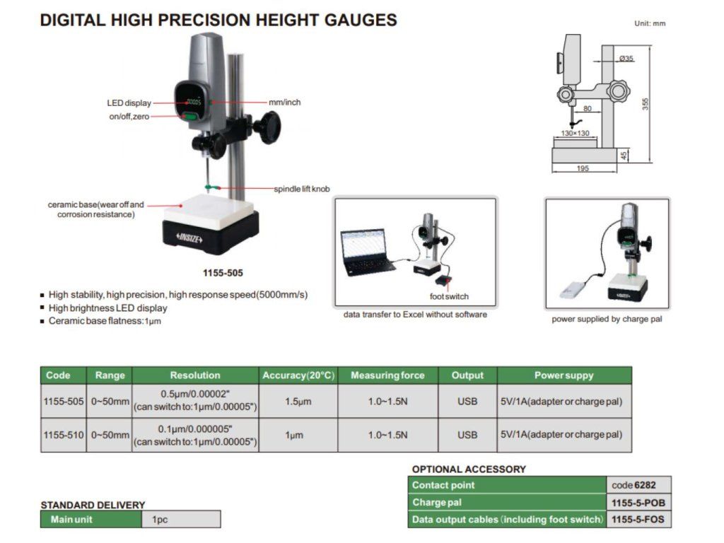 Șubler digital de înălțime de înaltă precizie INSIZE cu interval de măsurare 0- 50 mm, rezoluție 0,5 µm și precizie de măsurare 1,5 µm. Cu suprafață de măsurare din ceramică, display LED și ieșire date prin USB.