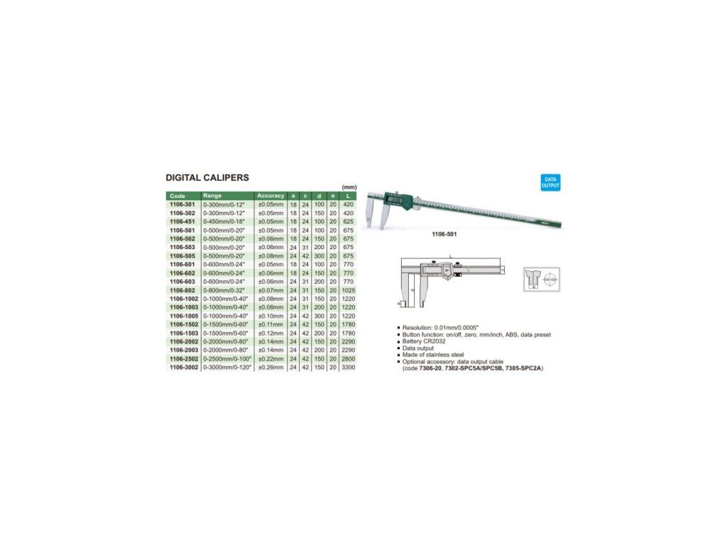 Șubler lung cu interval 0-600 mm și rezoluție 0,01 mm de la INSIZE. Lungimea ciocurilor inferioare este de 200 mm cu capete înguste teșite de 24 mm, cu ieșire de date.
