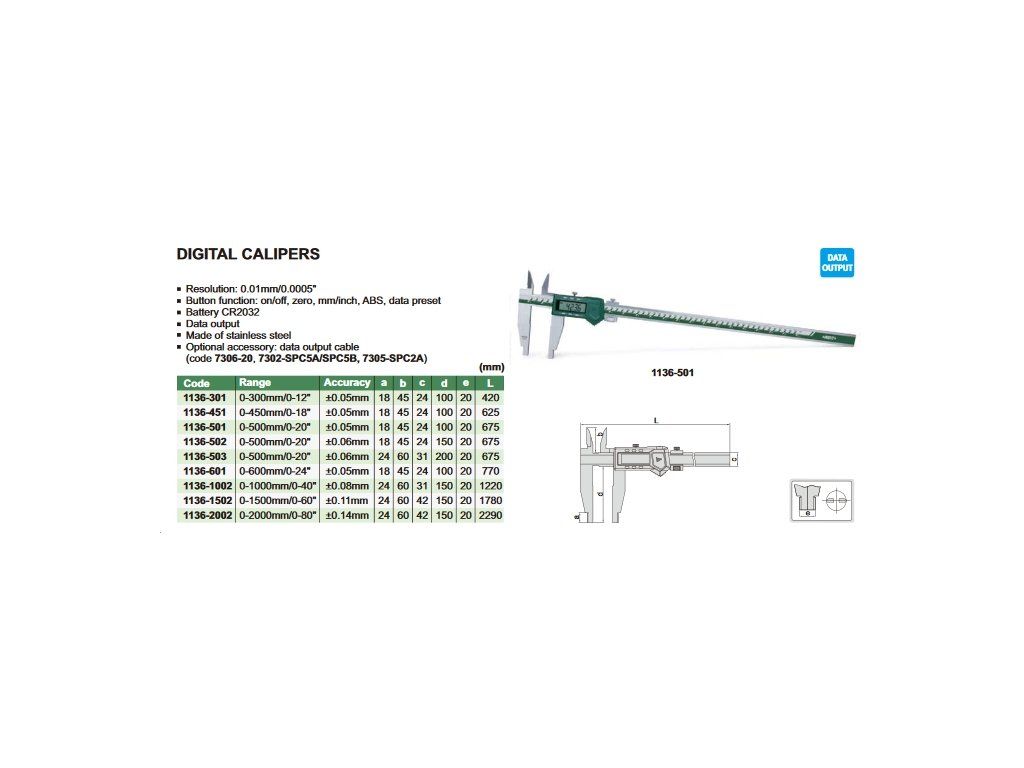 Șubler digital cu ciocuri teșite, cu interval 0-1000 mm și rezoluție 0,01 mm de la INSIZE. Lungimea ciocurilor inferioare este de 150 mm, cu port ieșire date.